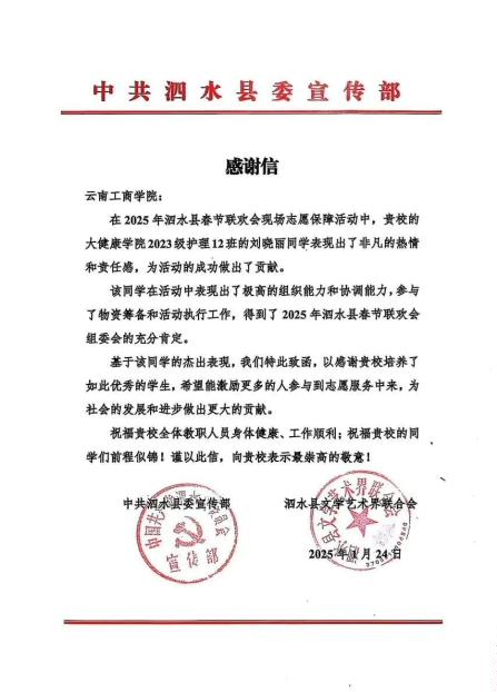 学校收到山东省泗水县委宣传部的感谢信,对大健康院2023级护理12班的刘晓丽同学在2025年寒假大学生“返家乡”社会实践活动中的表现给予肯定和赞扬。