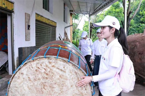 在景颇族象脚鼓制作工坊中,队员们化身“学徒”,沉浸式体验传统技艺:看传承人选料、制鼓身、蒙皮、装饰,亲手触摸木料纹理,感受“慢工出细活”的匠心;学习演奏“巴扎”乐器,在气息控制、节奏练习中,听懂民族文化的独特韵律。当健康专业遇上非遗传承,队员们发现:民族文化里藏着“疗愈力”,专业知识也能为文化传承注入活力——这是一场双向奔赴,让青春在跨界探索中,找到服务乡村振兴的新可能。