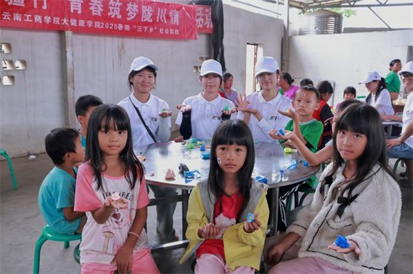 在陇川县罕等村活动中心,义诊活动热闹而有序。实践队员搭起临时诊疗点,给村民提供基础体检服务。除了测血压、量血糖,还为村民讲授海姆利克急救知识和乳腺自检检查知识,并现场演示简单的乳腺自检手法和海姆利克急救手法,同时,向村民讲解自我保健技巧。一位常年颈肩酸痛的村民,经队员按摩后舒坦不少,直夸队员们专业又贴心。在这里,队员们成了孩子们的“暑期伙伴”。玩彩泥、做游戏,笑声在院子里打转;讲健康小知识,把“爱护身体”变成趣味故事;分享励志故事,让奋斗精神悄悄在孩子心里扎根。看着孩子们眼中的光,队员们深知:一次陪伴、一堂小课,或许就能在孩子成长中种下向上的种子——这是乡村儿童需要的温暖,更是青春该传递的力量。