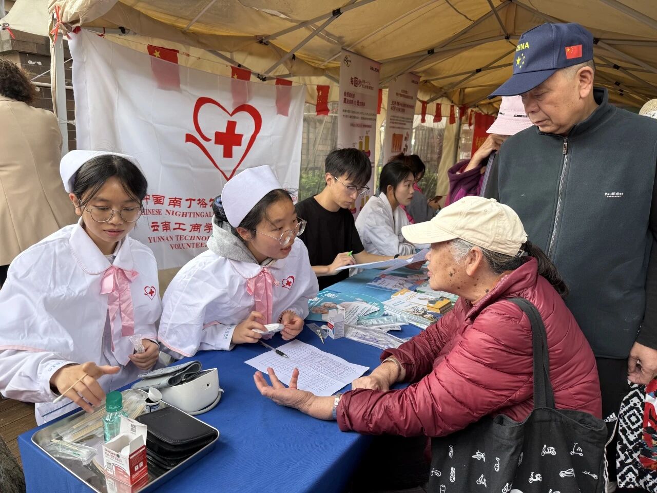 为弘扬尊老敬老传统美德,在重阳节之际,大健康学院党委牵头云南工商学院南丁格尔志愿护理服务队,联动双龙桥社区、黄家庄社区、永昌社区同步开展以“情暖重阳 科普同行 健康相伴 智慧养老”为主题的志愿服务活动,以党建引领聚合力,用专业服务与暖心关怀为社区老人送上节日祝福。